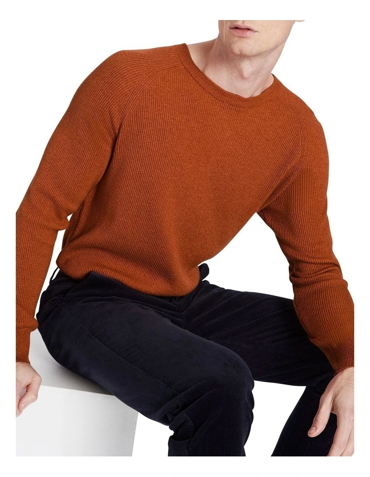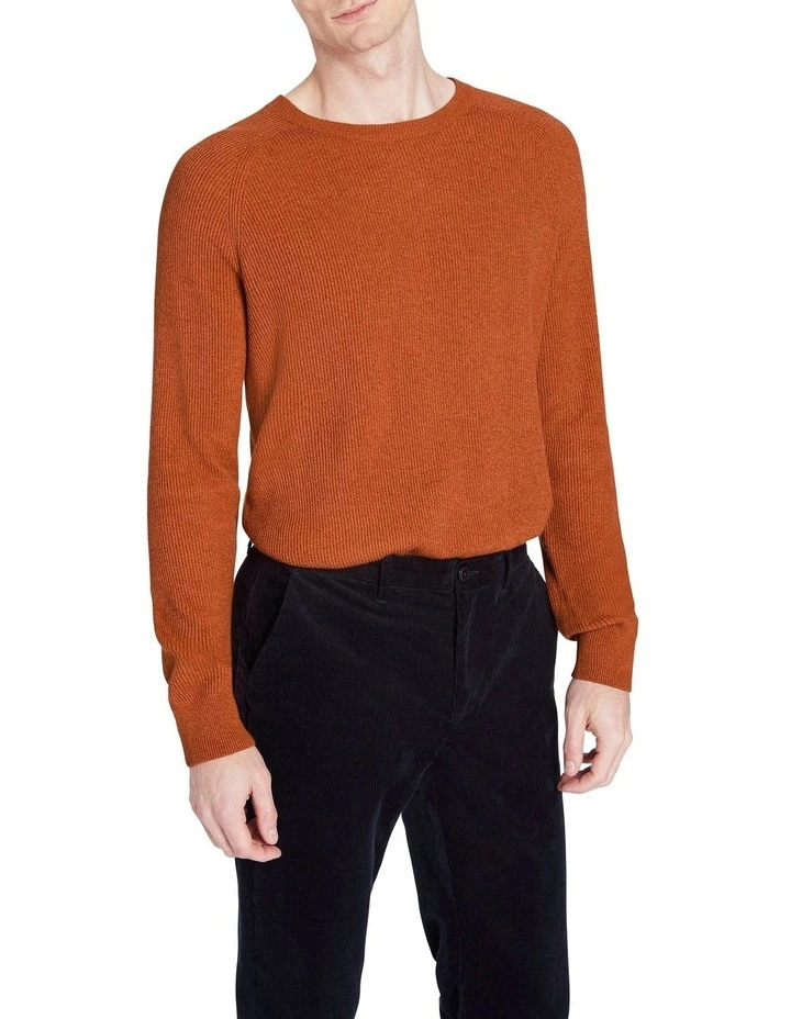 Revealing a rich rust colouring, this long sleeve knit sweater creates the perfect layering piece for winter, using a soft-touch yarn to show off a textured vertical rib throughout. Offering a regular fit with raglan shaping through the shoulders, the sweater is completed by a neat rib crew neckband and further subtle rib trim detailing at the sleeve cuffs and body hem.