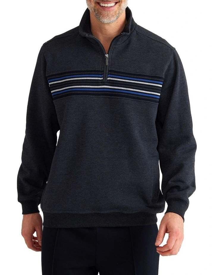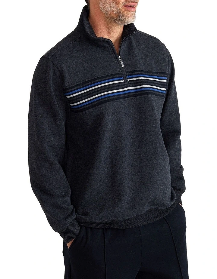 Our Snowy Mountain Fleece fabrication sets the benchmark of quality in the industry. This style brings a new take on our iconic jacquard panel sweat. The half zip placket design is modern and comfortable. For this design we have a modern tonal striped jacquard at the chest. Side pockets are added for all your storage needs. The jacquard chest panel features subtle grey marled tones with a pop of Galactic Cobalt.