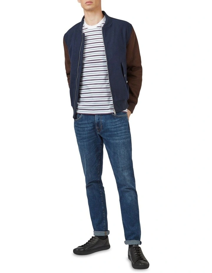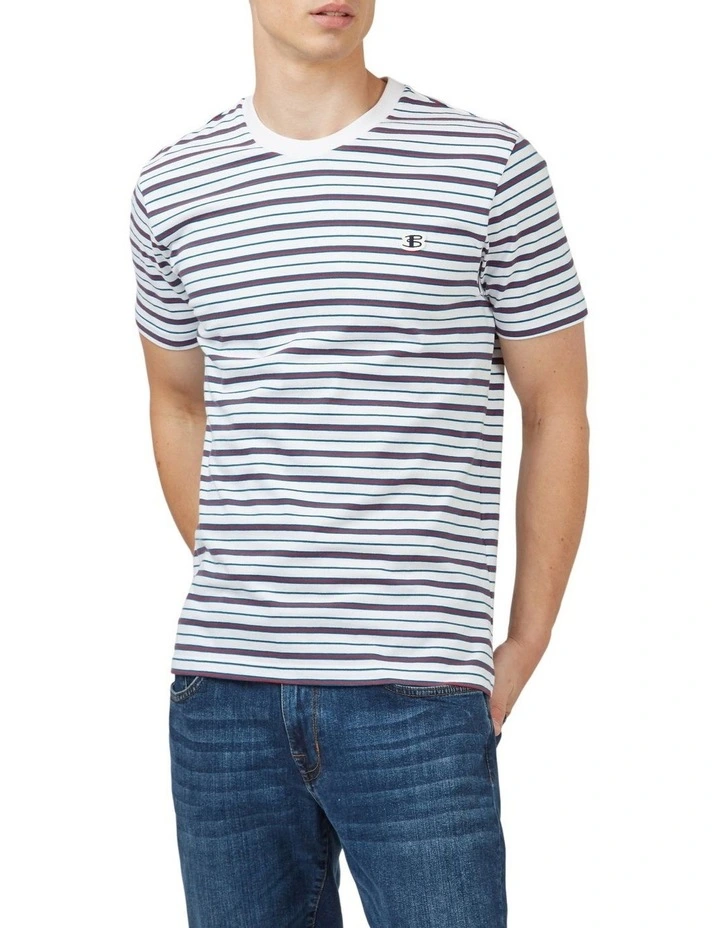 Cotton jersey tee with all over stripe design. Branded with a ”B” embroidered badge. Â