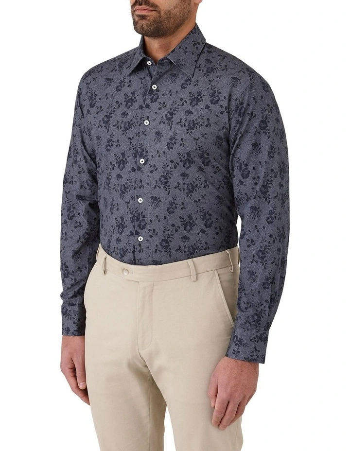 The Australian-designed Prahran Shirt is made from 100% cotton with a modern fit and semi-spread soft collar. The poplin base features a unique twill pattern and a denim and navy floral overprint, while the washed-back design creates a casual feel. Perfect for adding a touch of style to any outfit.