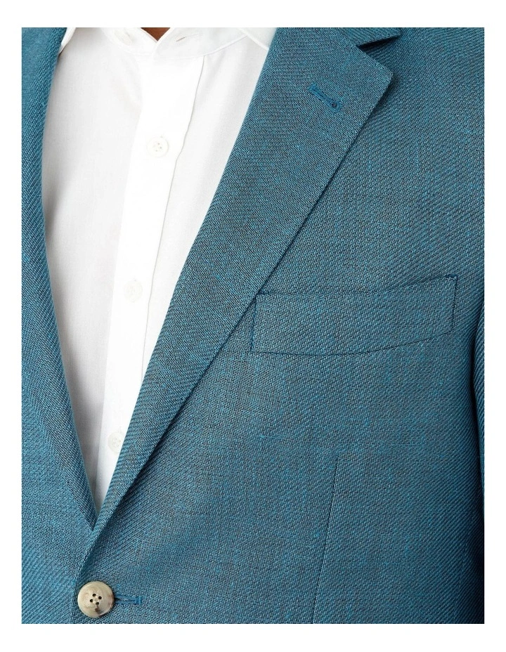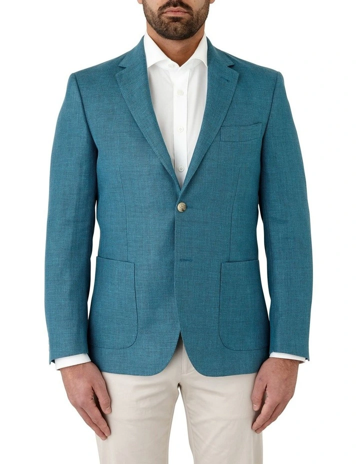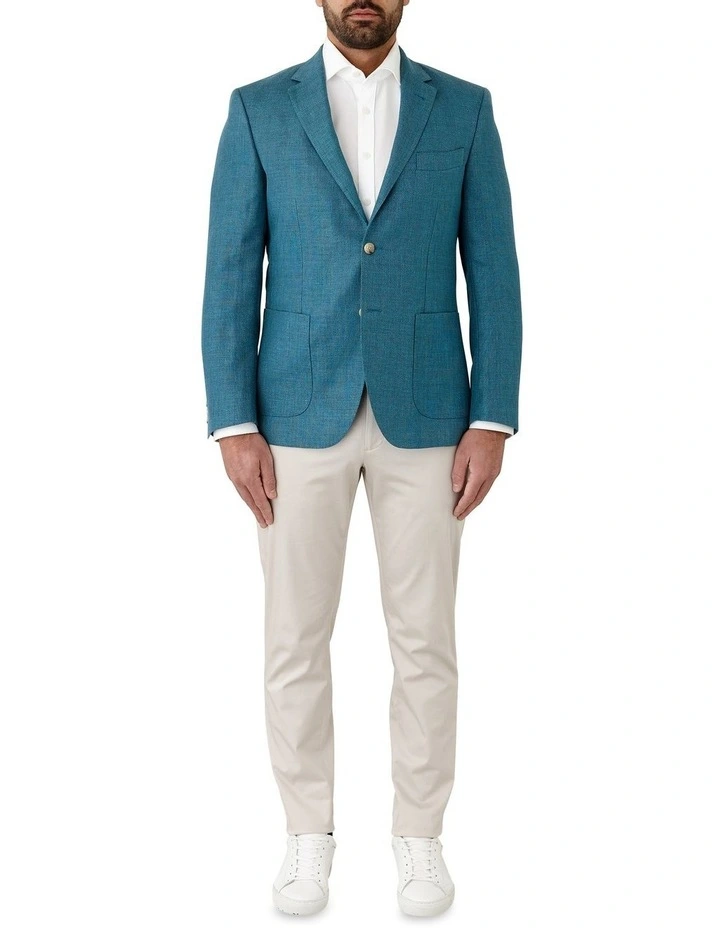 A raised textured twill construction with a polished finish in a teal colour. A unique jacket that would be a wonderful addition to any wardrobe. Can be worn with stone, grey, navy or blue trousers/chinos a perfect summer evening jacket for any occasion. Also available in Blue