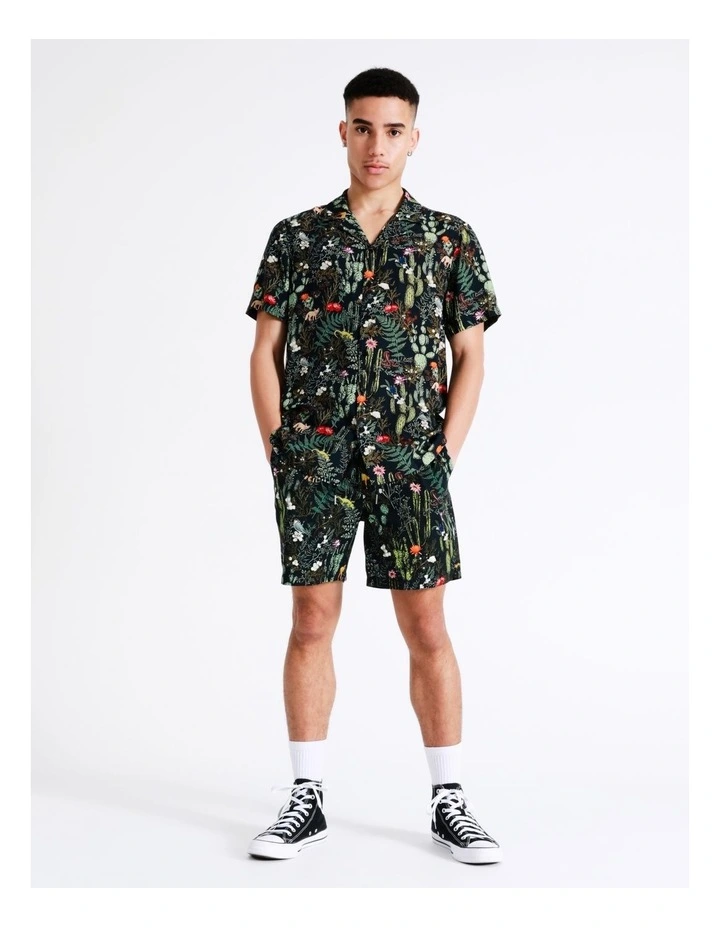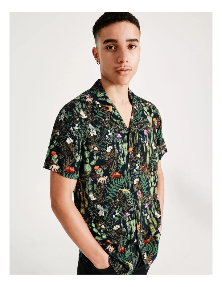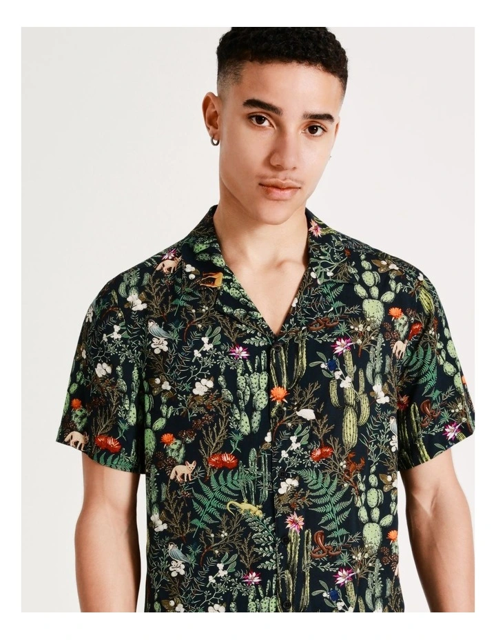 Kenji Desert Garden Print Short Sleeve Rayon Shirt in Navy