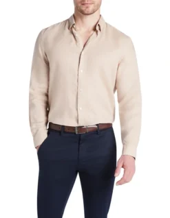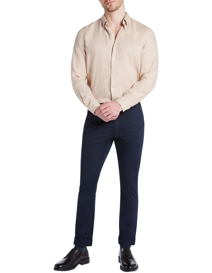 Entirely effortless, this long sleeve shirt makes dressing for summer oh-so easy, offering up an easy natural shade paired with contrast white buttons. Lightweight and breathable in pure linen, the shirt creates a regular fit with curved shaping at the hem, and is completed by a sharp shirt collar, a classic button front closure, and neat button-up cuffs.