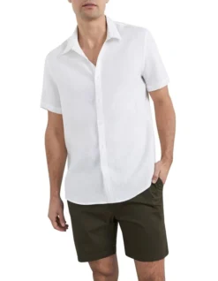 For effortless style, you can’t wrong with our Linen Classic Fit Shirt. Featuring an on-trend stripe and made from 100% linen, this button down shirt features short sleeves, a collar, and comfortable regular fit. Pair with our Textured Pull On Short and Reid Leather Crossover Slide. Our model is 187cm tall and wears a size M.