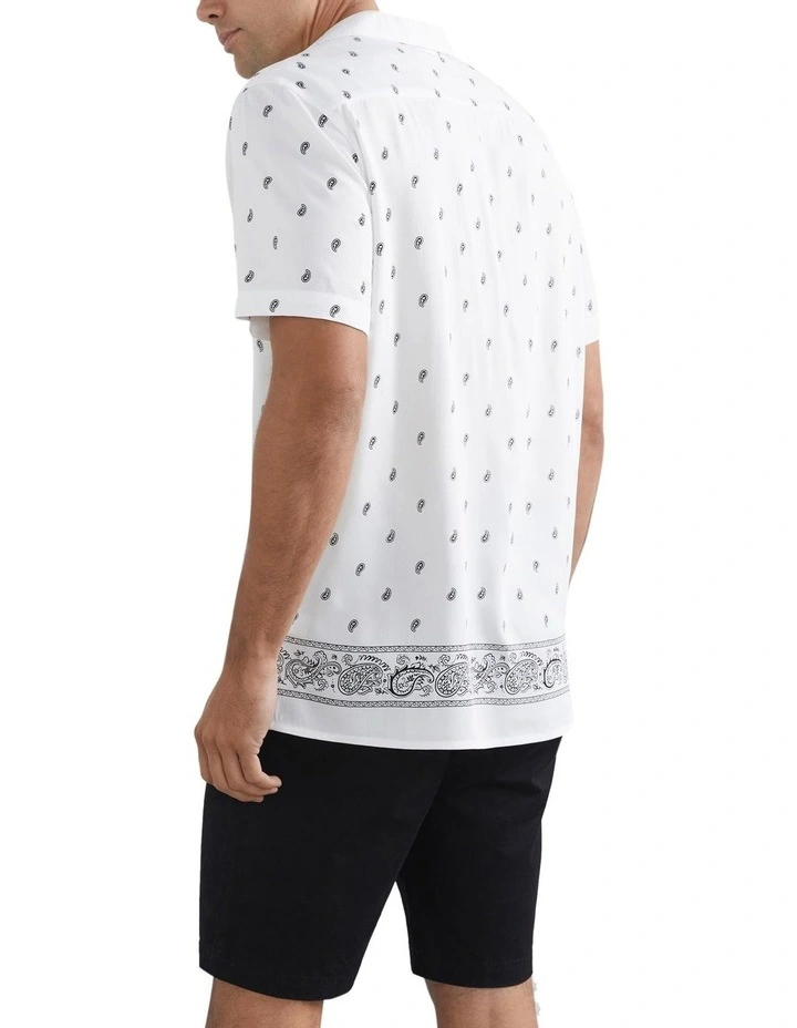 Make a statement with our Scarf Print Camp Collar Classic Fit Shirt. Featuring an on-trend scarf print, this shirt features a camp collar, short sleeves and comfortable regular fit. This garment is made from Viscoce, an eco-responsible viscose fibres made from naturally biodegradable wood pulp. Pair with our Slim Chino Short and Zane Leather Slide. Our model is 188cm tall and wears a size M.