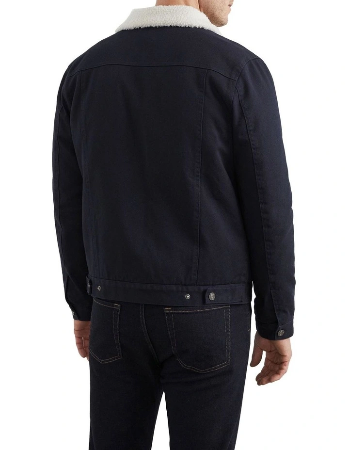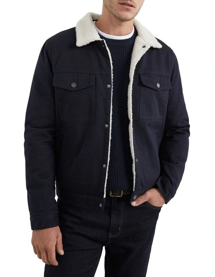 Our Twill Sherpa Jacket is the perfect way to stay warm this season. An update on our bestselling jacket, this jacket features a trendy twill fabrication, faux sherpa lining, two chest patch pockets, long sleeves, centre front closure with snap buttons. Pair with our Slim Fit Chino and Liam Leather Sneaker.Â