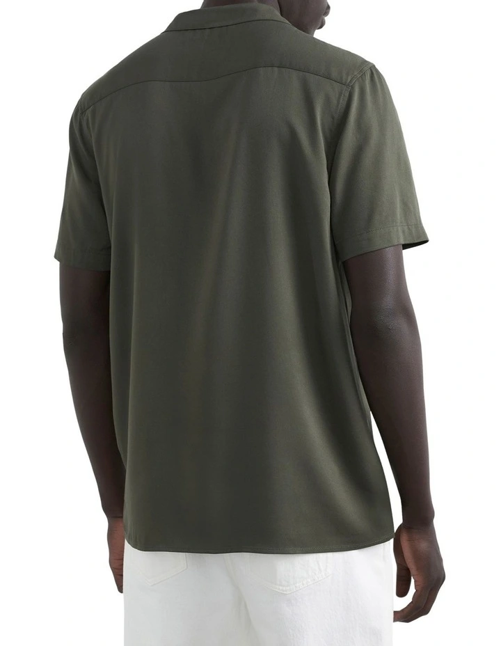 Our Viscose Camp Collar Classic Fit Shirt delivers effortless style. Available in multiple colourways, this solid colour casual shirt features a comfortable regular fit, camp collar, button down design and short sleeves. This garment is made from Viscose, a viscose fibres made from naturally biodegradable wood pulp. Pair with our Cropped Straight Jean and Reid Leather Crossover Slide. Model wearing our Khaki colourway wears a size AU M. Our model is 187cm tall. Model Wearing our Black colourway wears a size AU M. Our model is 188cm tall.