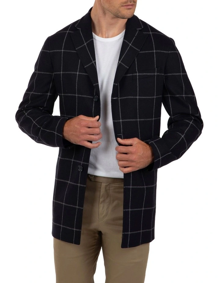 Off to the footy, or socially distanced dining outside your favouriterestaurant youll be warm in this slim fit Windowpane check wool blend navy MeltonMercury overcoat.