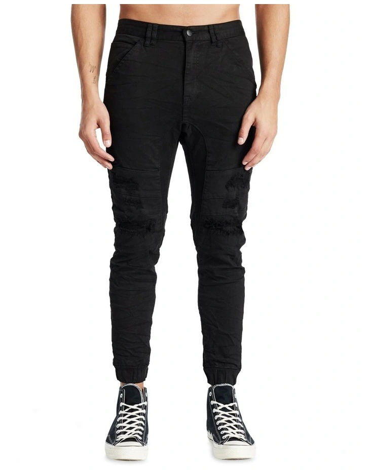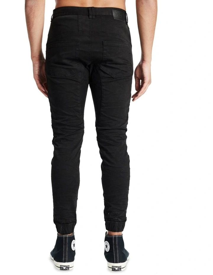 A signature staple of KSCY, this jogger pant features pin-tucked panelling down the length of the leg along with elastic ankles and a drop crotch gusset for a supreme level of comfort. Distressed detailing throughout brings an authentic worn vibe to the jean.
