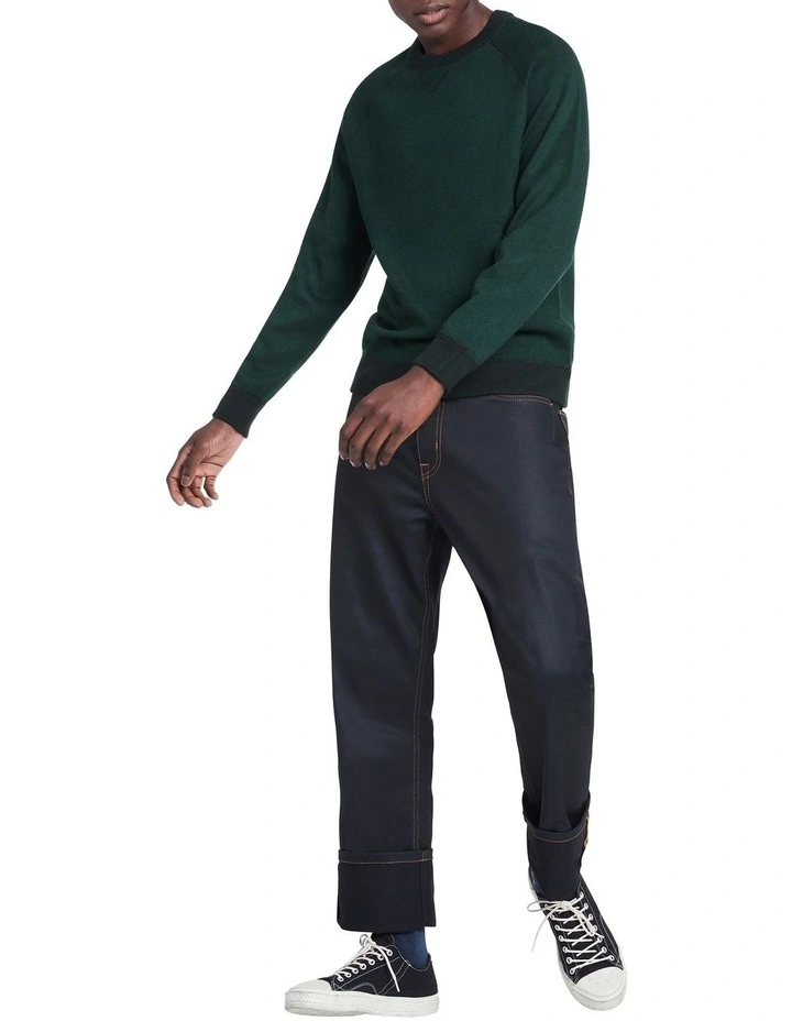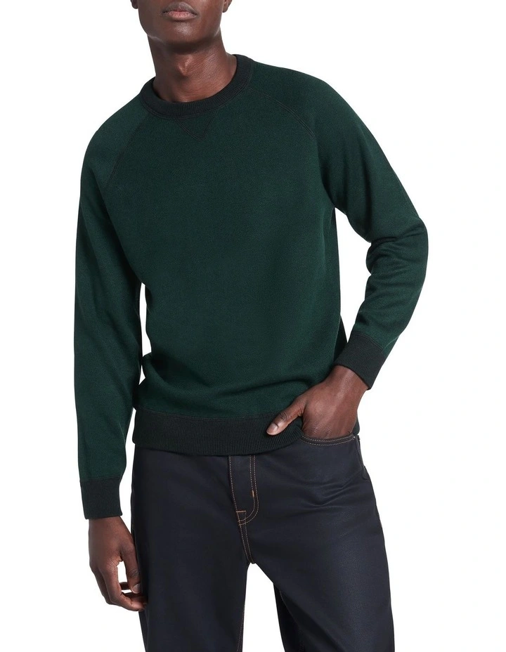 Delightfully soft, this long sleeve knit sweater is great for layering, showing off a rich green colouring with contrast rib trim detailing in a slightly darker green, found at the neck, cuffs and body hem. Flattering within a regular fit, the sweater shows off classic sweatshirt details, including raglan shaping at the shoulders, and a triangle insert feature at the crew neckline.