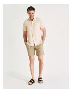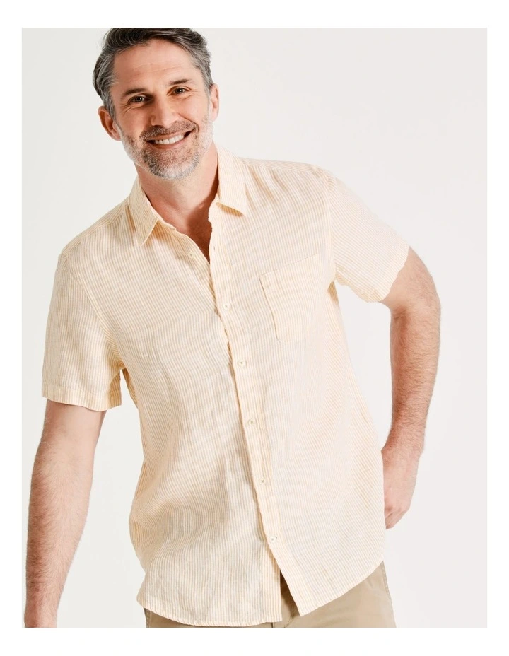 This comfortable linen shirt will be the perfect choice for warm weather. The green fabric breathes with ease and will keep you feeling and looking cool. Fastened with a button up front, the shirt features a fold over collar and a pin stripe print.Â
