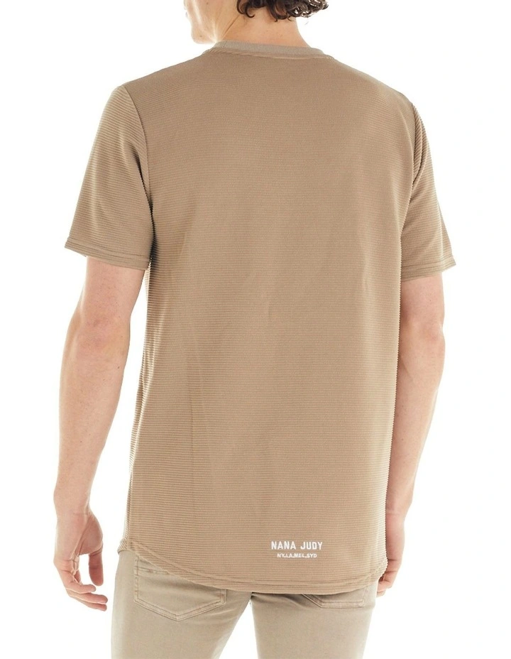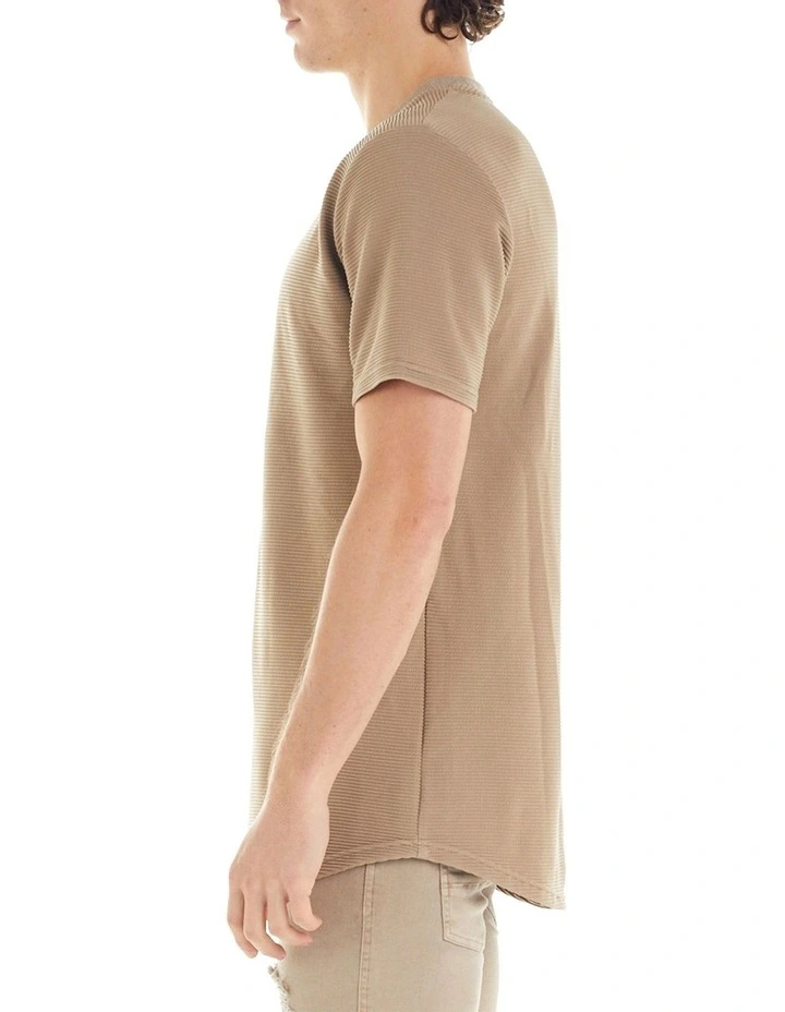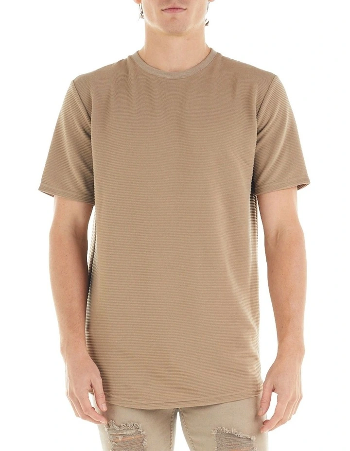 Features: Textured Stripe Fabrication, Curved Hemline, Crew Neck, Embroidered Back Hem Logo
