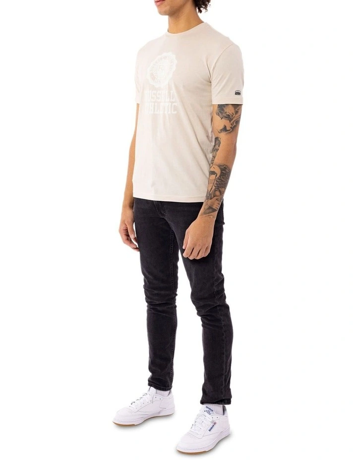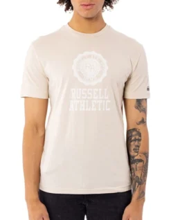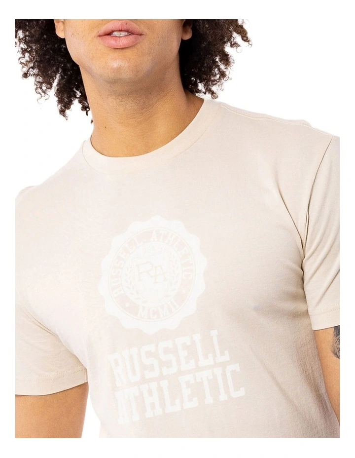 Elevate your everyday wardrobe with this Russell Athletic Collegiate Tee in beige. Featuring our unique Collegiate logo chest print, with a signature heat seal logo on the sleeve. The soft, breathable jersey fabric, ribbed neckline and classic fit makes this tee an everyday must have!