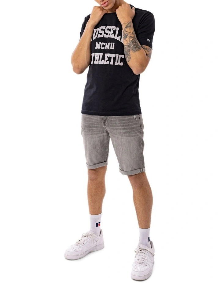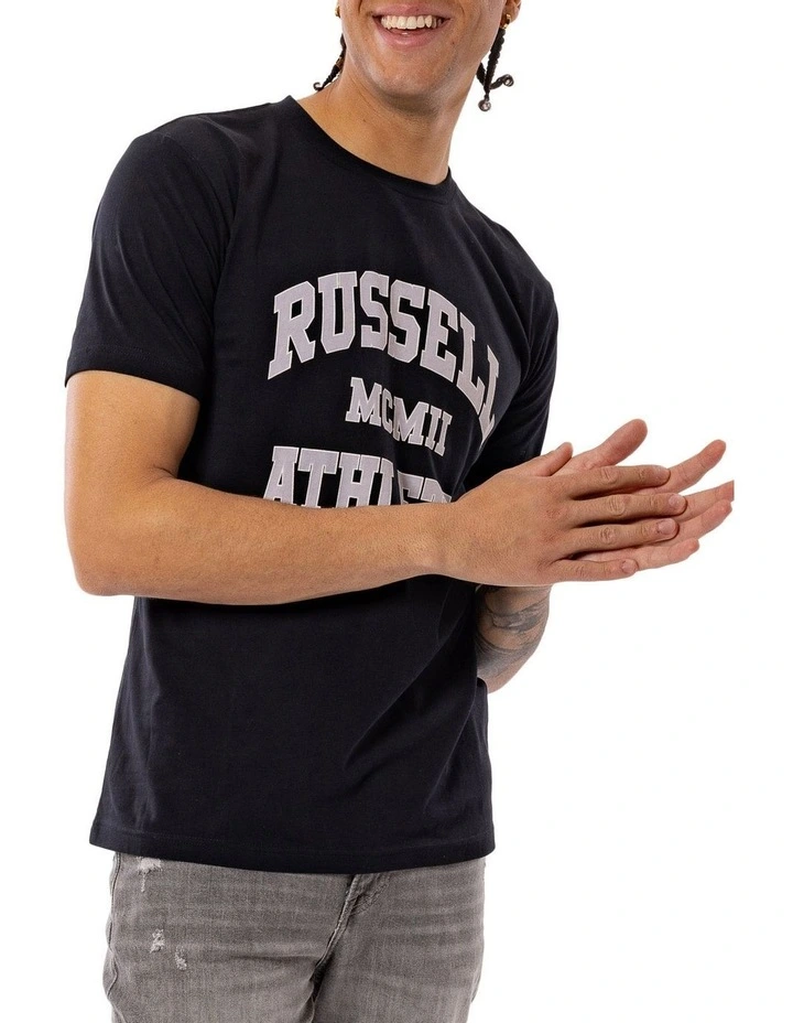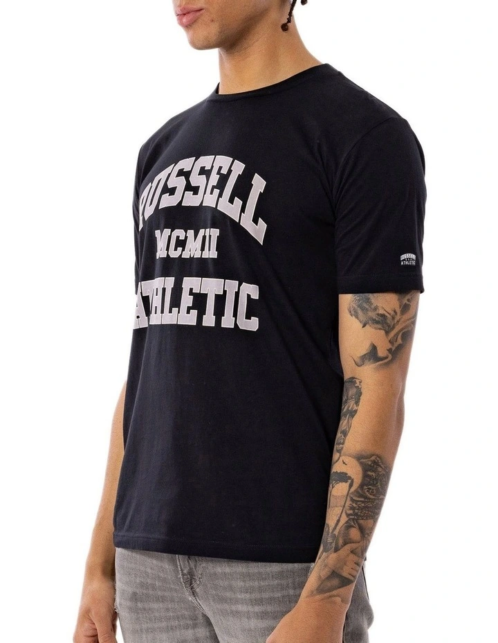 Elevate your everyday wardrobe with this Russell Athletic Numeral Arch Tee in black. Featuring a two-tone Russell Athletic Logo chest print, with a signature heat seal logo on the sleeve. The soft, breathable jersey fabric, ribbed neckline and classic fit makes this tee an everyday must have!