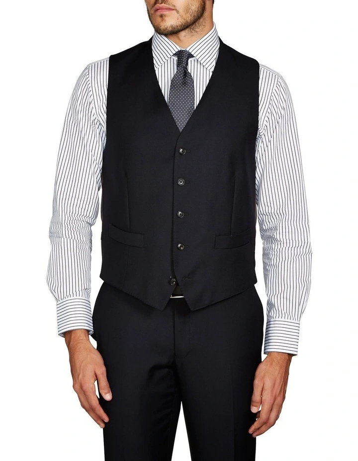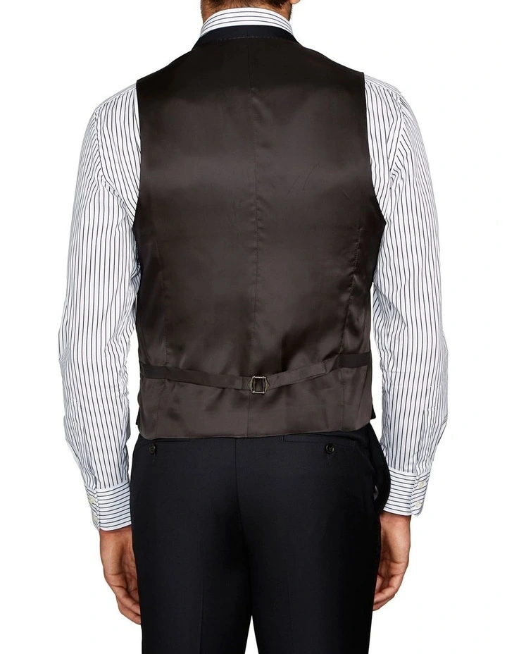 M.J. Bale’s Black Saunders Waistcoat crafted from 100% Super Fine Merino Wool is the perfect piece for formal events or a day in the office. The Saunders Waistcoat comes with welt pockets, Bemberg lining, five button closure and a buckle adjuster at the center of the back to create the ideal fit. Pair with the Saunders Black suit for an impeccable look.