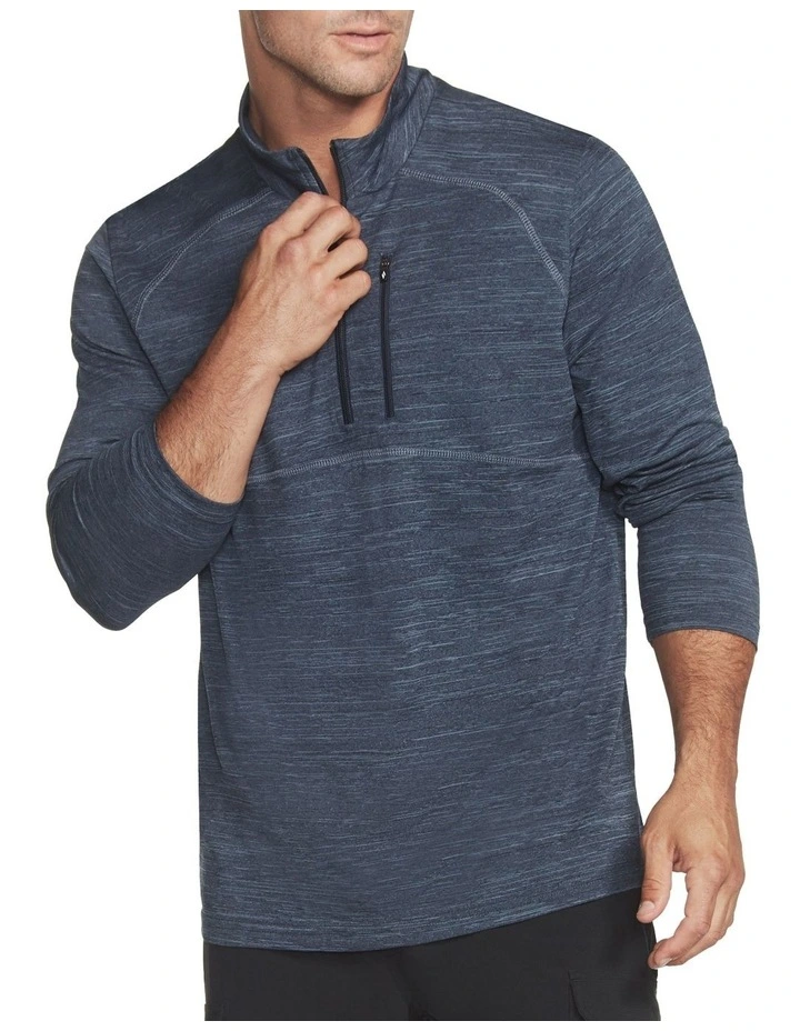 Find a common ground between athletic style and comfort wearing GODRI On the Road 1/4 Zip. This pullover features a lightweight GODRI ULTRA FLIGHT breathable spacedye jersey made for ultra movement, a mock neck with 1/4 zip, long sleeves, and an active fit.