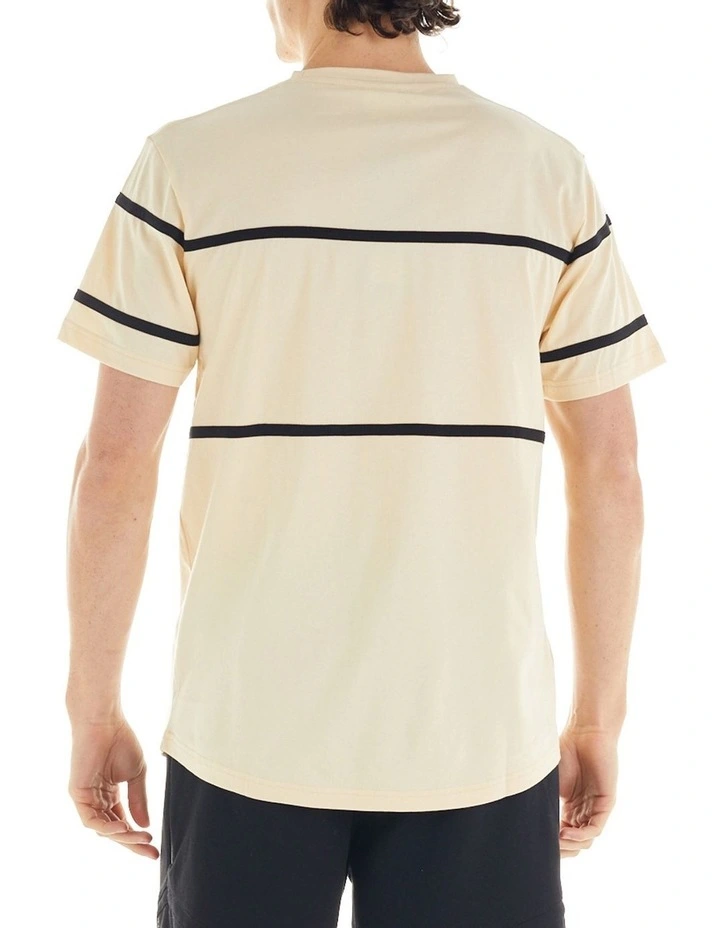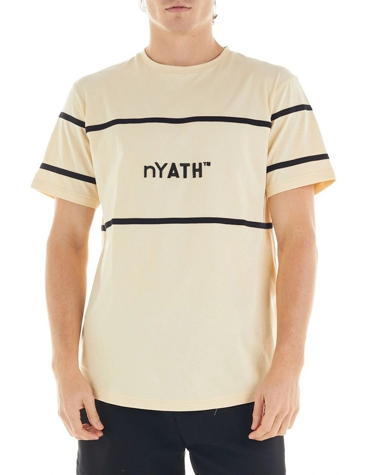 The nYATH by Nana Judy Skyline Tee is made in a premium soft washed cotton jersey in Beige. The T-shirt features contrast black piping trim across the chest & sleeve finished with high density embroidered logo. Designed on an original crew neck t-shirt block, with a curved hem finish and twin needle finishing to the sleeve & hem.Â