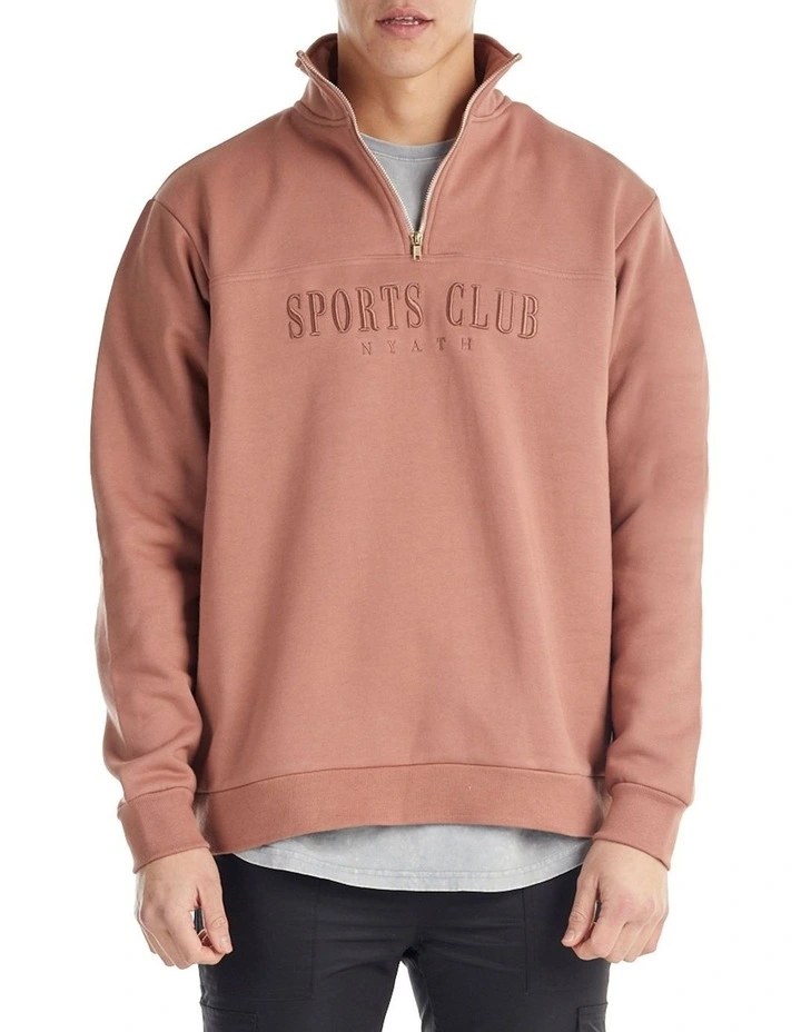 The nYATH Sports Club Quarter Zip Sweater in a premium brushed cotton blend fleece in Mauve  This classic piece is designed with raised tonal Sports Club Embroidery and yoke seam across the chest, with a matt silver finish zipper at the front neck.   Designed on an original sweater block with rib finish to the hem and sleeve cuff.Â
