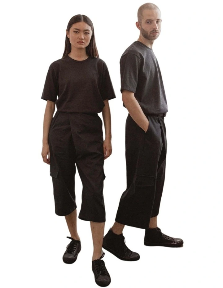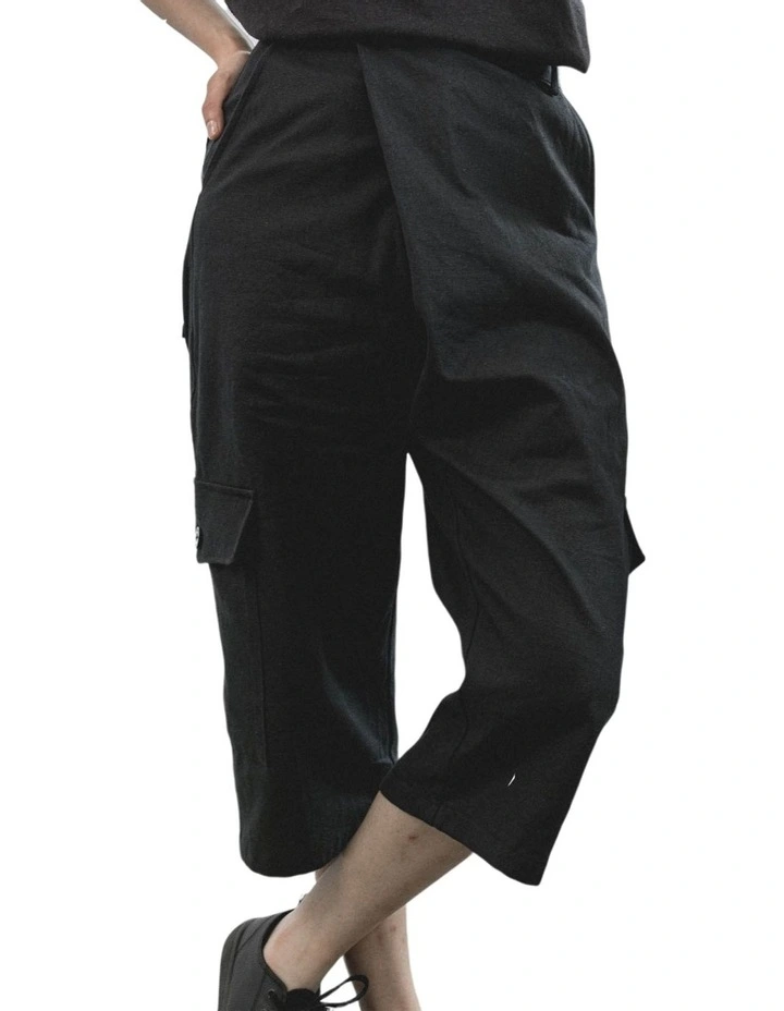 Unisex wrap over (quarter length) pants made using hemp/organic cotton canvas, including biodegradable buttons and front zip up opening.